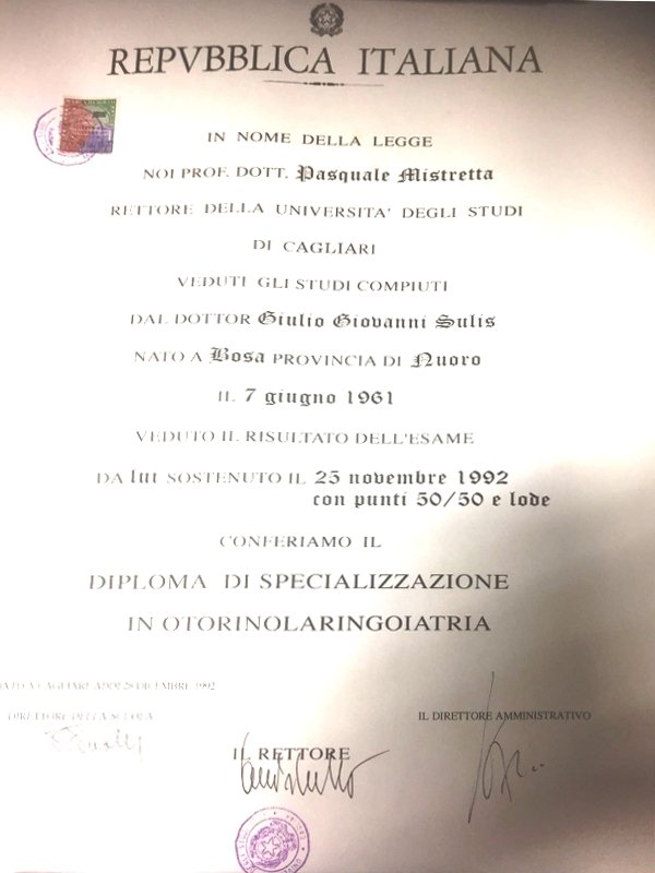 Conseguita il 20/12/1988 l’Abilitazione alla Professione di Medico Chirurgo e l’Iscrizione all’Albo dell’Ordine dei Medici della Provincia di Cagliari, si è iscritto alla Scuola di Specializzazione in Otorinolaringoiatria presso la Clinica Otorinolaringoiatria dell’Università degli Studi di Cagliari conseguendo, il 25/11/1992, la Specializzazione in Otorinolaringoiatria con il punteggio 50/50 e lode, discutendo la tesi dal titolo: