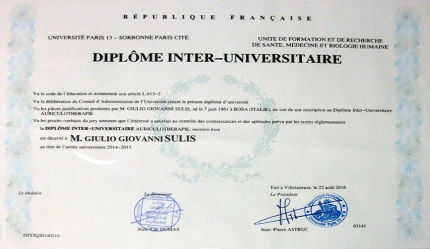 Nel 2015 consegue il Diploma interuniversitario di Auricoloterapia presso Università Parigi 13.